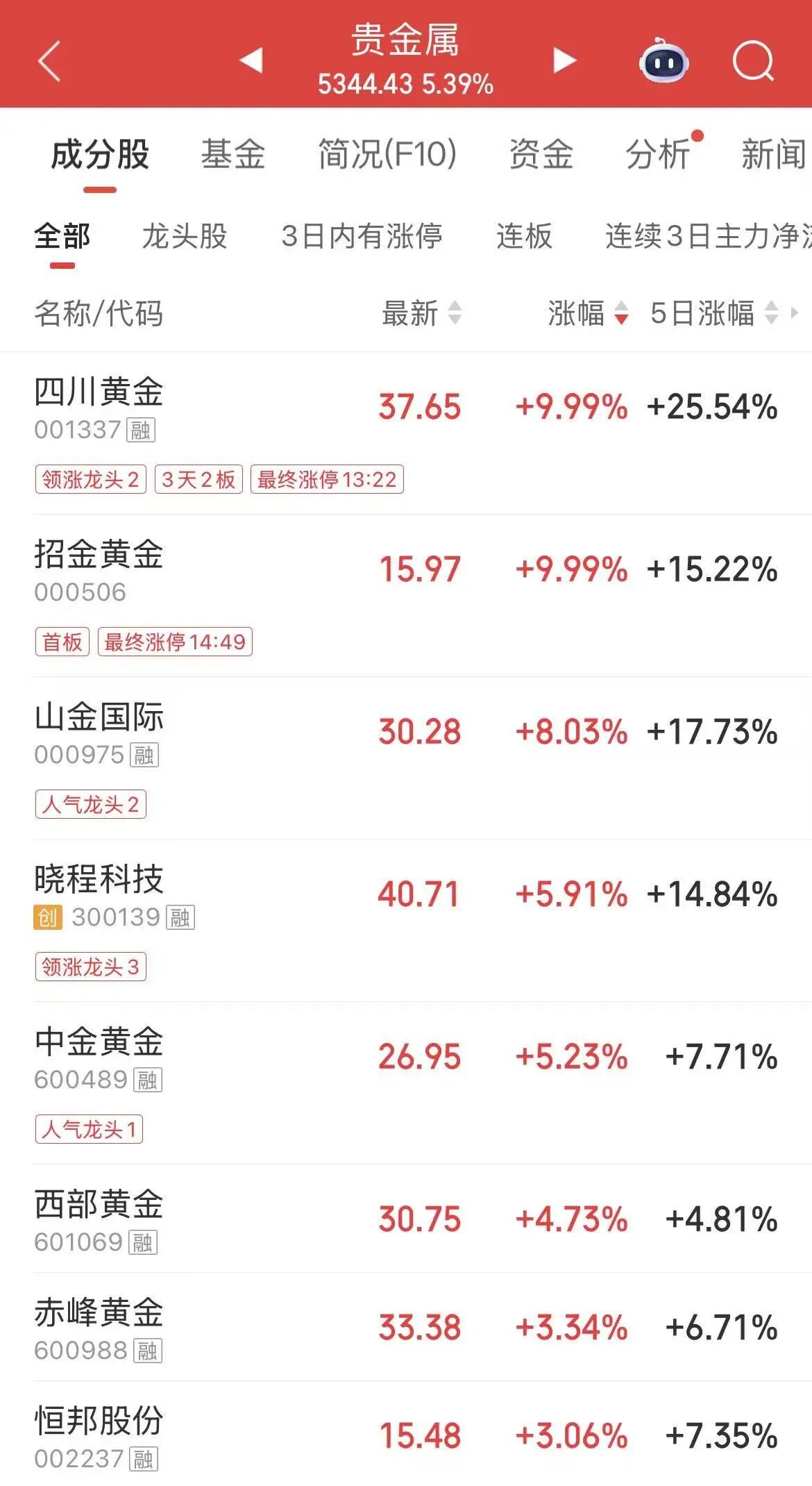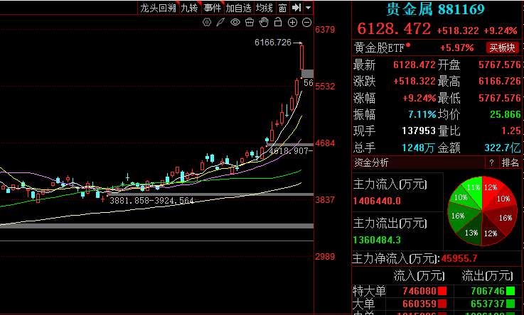 自上周三以来,A股回落震荡,在日K线的起起伏伏中,越来越多的股民正在读懂市场风向。 对于大盘,在大资金借道宽基ETF买入和赎回的影响下,大起走势暂歇,但又不至于大落。 趋势上,它们的量能较峰值一度有所回缩,但都离爆量赎回之前的常态,还有不小的距离。 而对于板块和个股,经过几个交易日的拉锯、演绎,相信大家也能看到,资金 正 在前期热门题材中边打边撤。 而另一边,新的领涨板块已经出现。 数据 显示 ,截至 周三 收盘,近5个交易日涨幅最大的是贵金属,涨幅超过23%。 分析完大盘,我们再来看看本周盘...